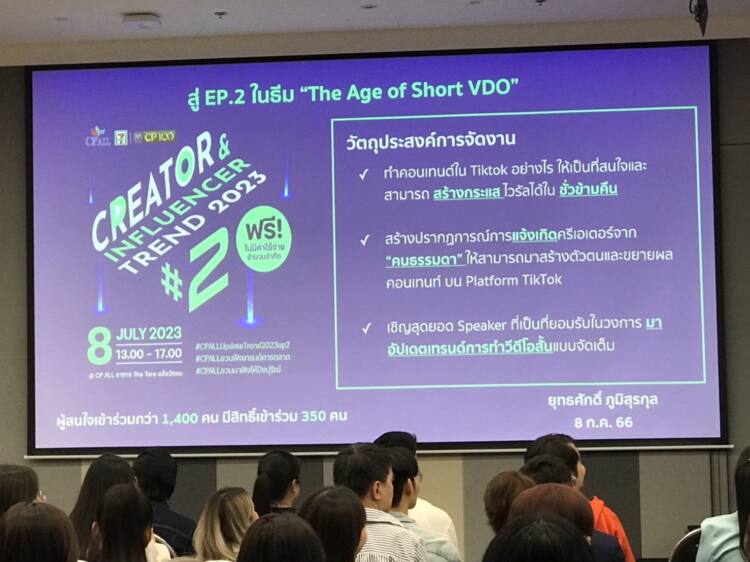 10ก.ค.66 / หลังจากประสบความสำเร็จและมีกระแสเรียกร้องหลังจบงาน CP ALL Creator & Influencer Trend 2023 ไปเมื่อต้นปีที่ผ่านมา ซีพี ออลล์ จึงได้จัดงาน CP ALL Creator & Influencer Trend 2023 #2 อีกครั้งในธีมสุดล้ำ “The age of short VDO” เมื่อสมาธิคนเปลี่ยนไป คอนเทนต์ครีเอเตอร์ยุคใหม่ต้องทำวิดีโอสั้น เพราะยิ่งปรับตัวเร็วเท่าไหร่ คอนเทนต์ก็จะปังเร็วขึ้นเท่านั้น โดยได้รับความสนใจจาก Creator และ Influencer ลงทะเบียนสมัครมากว่า 1,500 คน และมีผู้ผ่านการคัดเลือกร่วมงานรวมกว่า 350 คน