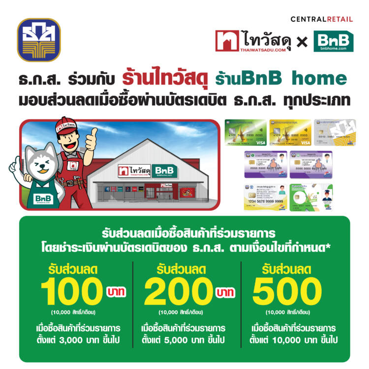ธนาคารเพื่อการเกษตรและสหกรณ์การเกษตร (ธ.ก.ส.) ร่วมมือกับบริษัท ซีอาร์ซี ไทวัสดุ จำกัด (มหาชน) มอบสิทธิพิเศษให้ลูกค้าผู้ถือบัตรเดบิต ธ.ก.ส. ทุกประเภท เพียงซื้อสินค้าที่เข้าร่วมรายการตามยอดที่กำหนด กดรับสิทธิ์ผ่าน Line Official Accounts BAAC Family และ Facebook Page: ธกส BAAC Thailand ณ ร้านไทวัสดุ และร้าน บีเอ็นบี โฮม สาขาที่เข้าร่วมรายการ และชำระผ่านบัตรเดบิต ธ.ก.ส. โดยเมื่อซื้อครบทุก 3,000 บาทขึ้นไป รับส่วนลดทันที 100 บาท ต่อใบเสร็จ (จำกัด 10,000 สิทธิ์/เดือน) เมื่อซื้อครบทุก 5,000 บาทขึ้นไป รับส่วนลดทันที 200 บาท ต่อใบเสร็จ (จำกัด 10,000 สิทธิ์/เดือน) และเมื่อซื้อครบทุก 10,000 บาทขึ้นไป รับส่วนลดทันที 500 บาท ต่อใบเสร็จ (จำกัด 10,000 สิทธิ์/เดือน) ส่วนลดนี้ไม่สามารถเปลี่ยนเป็นเงินสด และไม่สามารถใช้ร่วมกับส่วนลด หรือรายการส่งเสริมการขายอื่นได้ ตั้งแต่วันนี้จนถึง 30 มิถุนายน 2567
