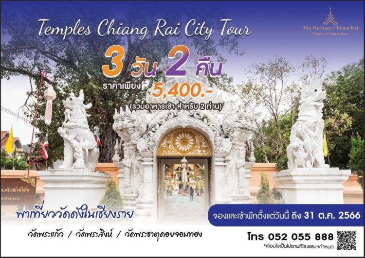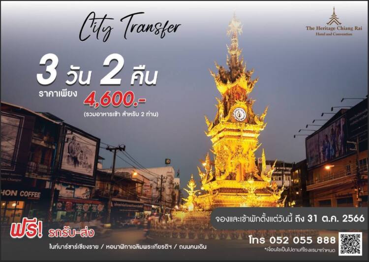ทุกแพ็คเกจมีบริการ Wifi ชากาแฟในห้องพัก ฟิตเนส สระว่ายน้ำ สวนแมกไม้ร่มรื่น และอื่นๆอีกมากมาย ตั้งแต่ วันนี้ – 31 ตุลาคมนี้ สอบถามข้อมูลเพิ่มเติมหรือจองได้ที่โทร 0-5205-5888 Line ID: @335tkcsv และ: https://shorturl.asia/Upc2n หรือ www.heritagechiangrai.com