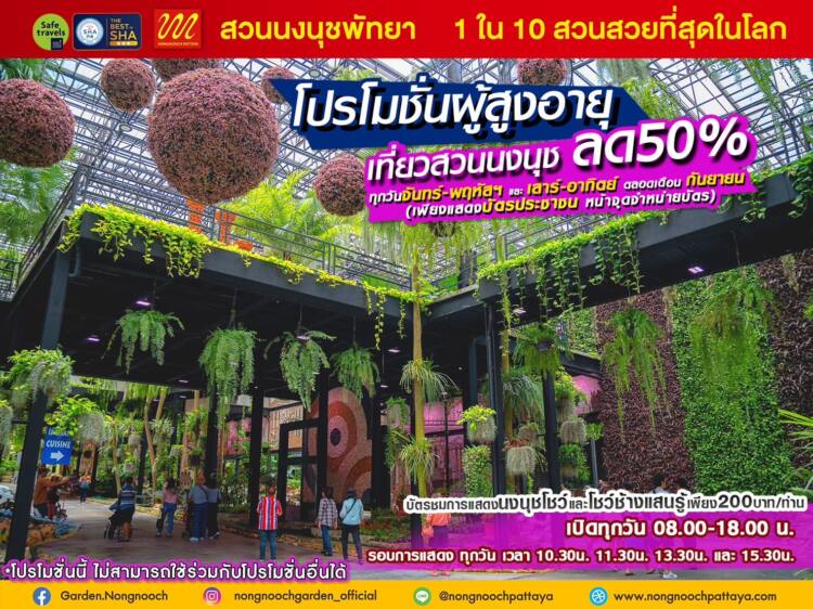 สวนนงนุชพัทยา จัดโปรโมชั่นพิเศษไทยเที่ยวไทยสำหรับผู้สูงอายุ (อายุตั้งแต่60ปี ขึ้นไป )ซื้อบัตรผ่านประตูในราคาลด 50 เปอร์เซ็นต์ ตลอดเดือนกันยายน 2566 ทุกวันจันทร์ ถึง วันพฤหัสบดี และวันเสาร์-อาทิตย์ ส่วนวันศุกร์ยังคงโปรโมชั่นเดิมผู้สูงอายุเข้าชมสวนฟรี