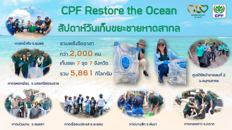 บริษัท เจริญโภคภัณฑ์อาหาร จำกัด (มหาชน) หรือ ซีพีเอฟ รวมพลังจิตอาสาพนักงานและชุมชนกว่า 2 พันคนเก็บขยะชายหาด 7 จุด ใน 7 จังหวัด เนื่องในสัปดาห์วันเก็บขยะชายหาดสากล (International Coastal Cleanup Day) ระหว่างวันที่ 6-15 กันยายน 2566 สามารถเก็บและคัดแยกขยะได้กว่า 5,861 กิโลกรัม เพื่อร่วมปกป้องระบบนิเวศ คืนสภาพทะเลสู่ความอุดมสมบูรณ์