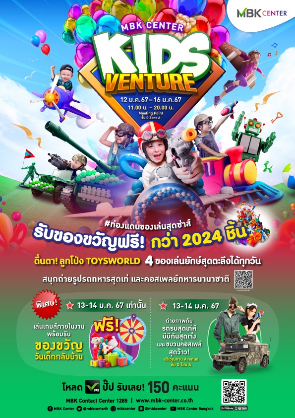 เริ่มจาก ศูนย์การค้าเอ็ม บี เค เซ็นเตอร์ เชิญชวนเด็ก ๆ มาร่วมงานในคอนเซปต์ ท่องแดนของเล่นสุดซ่าส์ ในวันศุกร์ที่ 12 – วันอังคารที่ 16 มกราคม 2567 บริเวณ Meeting Point ชั้น G ตื่นตาไปกับลูกโป่ง Toys world พร้อมด้วย 4 ของเล่นยักษ์ สุดตะลึง และร่วมถ่ายรูปกับลูกโป่งกว่า 10,000 ลูก พลาดไม่ได้ วันเสาร์ที่ 13 และ วันอาทิตย์ที่ 14 มกราคม 2567 สนุกไปกับการถ่ายรูปรถรบสุดเท่ บีบีกันสุดเจ๋ง และขบวนคอสเพลย์สุดว้าว และรับของขวัญวันเด็กกลับบ้าน ณ ลานเอ็ม บี เค อเวนิว โซน A ศูนย์การค้าเอ็ม บี เค เซ็นเตอร์