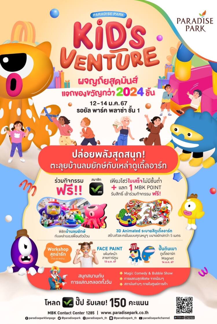 เอ็ม บี เค เซ็นเตอร์ พาราไดซ์ พาร์ค เดอะไนน์ เซ็นเตอร์ พระราม 9 และ เดอะไนน์ เซ็นเตอร์ ติวานนท์ ศูนย์การค้าในเครือ เอ็ม บี เค ต้อนรับเทศกาลวันเด็กแห่งชาติ มอบความสนุก เอาใจน้อง ๆ หนู ๆ พร้อมร่วมสร้างเสียงหัวเราะ แจกของขวัญรวมกว่า 2,024 ชิ้นในงาน KID’S VENTURE 2024
