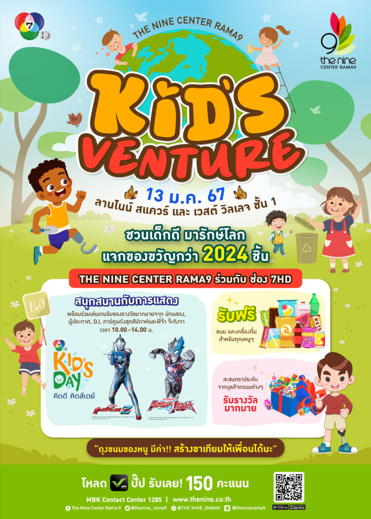 ปิดท้ายที่ ศูนย์การค้าเดอะไนน์ เซ็นเตอร์ พระราม 9 ร่วมกับช่อง 7HD เปิดพื้นที่ KID’S VENTURE 2024 จัดงาน “7HD คิดดี คิดส์เดย์ ” ชวนเด็กดี มารักษ์โลก แจกของขวัญ พร้อมเล่นเกม พบปะนักแสดง ผู้ประกาศ DJการ์ตูนดังสุดสัปดาห์ พี่จ้า จ๊ะทิงจา พร้อมร่วมสนุกกับโซนต่าง ๆ ทั้งความสุขและความสนุก และถ้าใครมีถุงขนมสามารถมาร่