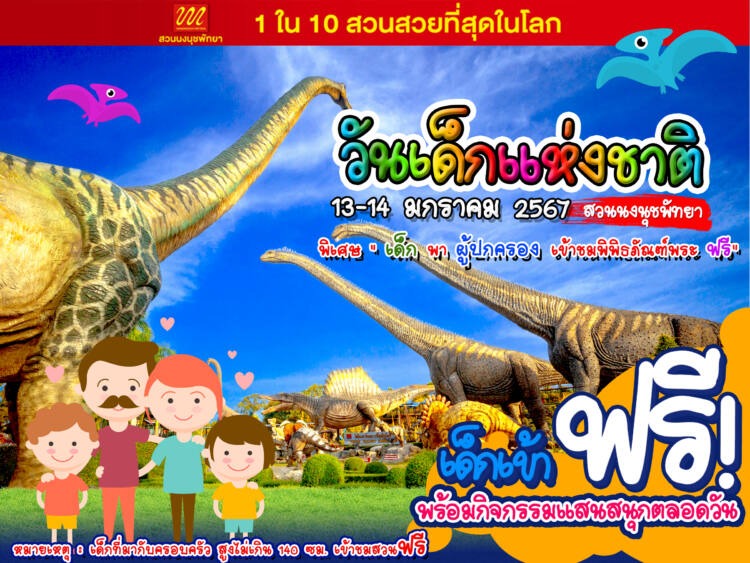 เด็กที่มากับผู้ปกครอง มีความสูงไม่เกิน 140 เซนติเมตร เข้าชมสวนสวยฟรีทุกวัน ในส่วนของกิจกรรมทางสวนนงนุชพัทยาได้จัดเวทีการแสดงให้น้องๆ หนูๆ ได้ร่วมสนุก พร้อมรับของรางวัลเตรียมไว้แจกฟรีมากมายและสามารถเข้าชมสวนที่ติด1ใน10 สวนที่สวยที่สุดในโลก มีโซนไดโนเสาร์ที่มีมากกว่า 1,300 ตัว รอให้การต้อนรับเด็กๆ