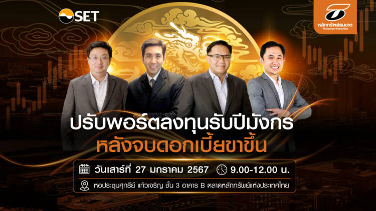 ในวันเสาร์ที่ 27 มกราคม 2567 เวลา 9.00 – 12.00 น. ณ หอประชุมศุกรีย์ แก้วเจริญ ชั้น 3 อาคาร B ตลาดหลักทรัพย์ แห่งประเทศไทย
