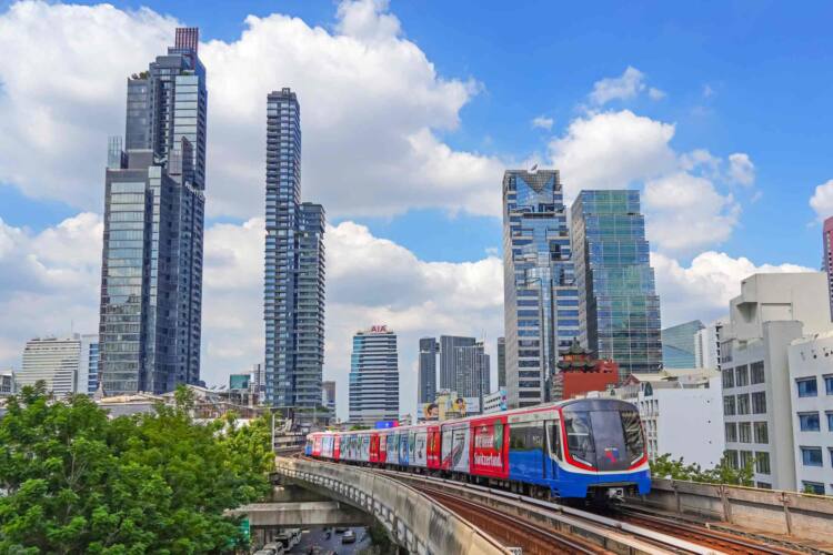 View of Bangkok skyline and skyscraper with BTS skytrain BTS sky train runs through the station. 06 december 2023.