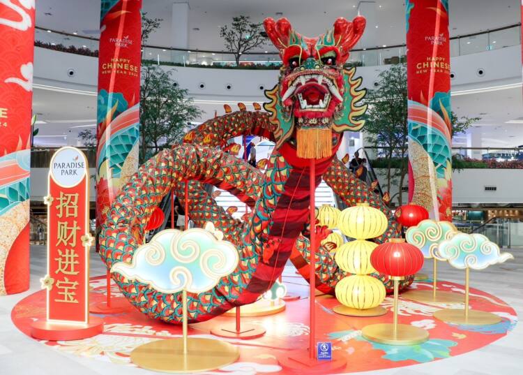ส่วน พาราไดซ์ พาร์ค พบกับจุดถ่ายภาพสุดปังกับ “มังกร” ที่หมุนตัวเป็นเลข 8 ในมุมแนวนอน มองดูเหมือนสัญลักษณ์ อินฟินิตี้ (infinity) ตั้งตระหง่านบริเวณทางเข้า ท่ามกลางการตกแต่งด้วยโคมไฟและก้อนเมฆ รวมทั้งข้อความตัวอักษรจีนที่มีความหมายมงคล “เจาไฉจิ้นเป่า” แปลว่า เงินทองไหลมาเทมา ทรัพย์สมบัติไหลเข้าบ้าน ขณะเดียวกันในทุก ๆ ชั่วโมง มังกรจะพ่นควันออกมา เรียกว่าสร้างความตื่นตาตื่นใจให้กับลูกค้าที่มาใช้บริการ นอกจากนี้ยังมีการประดับป้ายข้อความภาษาจีนและรูปมังกร ซึ่งเป็นเสมือนคำอวยพรให้กับลูกค้าทุกท่าน ในวันศุกร์ที่ 9 กุมภาพันธ์ 2567 เวลา 12.00 น. เป็นต้นไป พบกับโชว์แสดงเชิดมังกรทองคำ สิงโต 8 สี 8 มงคล ระบำจีนหงส์-มังกรมงคล