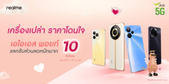 กรุงเทพฯ 13 กุมภาพันธ์ 2567 – AIS x realme วาเลนไทน์นี้พิเศษสุด! realme แบรนด์สมาร์ตโฟนเพื่อคนรุ่นใหม่ที่เติบโตเร็วที่สุดในโลก จับมือ AIS เครือข่ายสัญญาณชั้นนำของเมืองไทย จัดโปรใหญ่ฉลองเดือนแห่งความรักกับ “AIS Campaign10Point” ตั้งแต่วันที่ 1-29 กุมภาพันธ์ 2567 ลูกค้า AIS สามารถนำคะแนนสะสม 10 แต้ม แลกรับส่วนลดทันทีสูงสุดถึง 1,500 บาท สำหรับซื้อสมาร์ตโฟน realme หลากหลายรุ่น ตั้งแต่ C-series สมาร์ตโฟนบัดเจ็ตสเปกแรงเกินคุ้ม ไปจนถึงรุ่นท็อปอย่าง Number-series ห้ามพลาด! realme ชวนสัมผัสนิยามใหม่แห่งประสบการณ์สมาร์ตโฟนระดับเริ่มต้นกับรุ่นล่าสุด “realme Note 50” ที่มอบความคุ้มค่าพร้อมประสิทธิภาพการใช้งานที่เหนือคู่แข่งในกลุ่มเดียวกัน พร้อมให้คุณจับจองของขวัญสุดพิเศษสำหรับคนรู้ใจได้แบบสบายกระเป๋ามากกว่าเดิมแล้ววันนี้ที่ศูนย์ AIS ทั่วประเทศและ AIS Online Store ตลอด 24 ชั่วโมง!