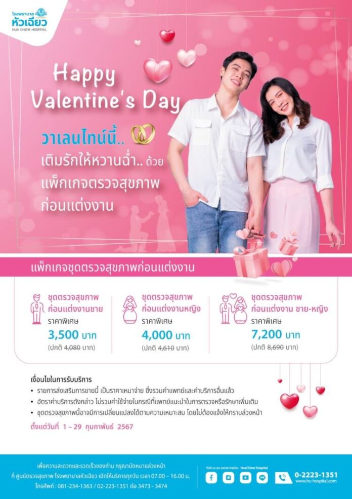 ในเดือนแห่งความรักปีนี้.. โรงพยาบาลหัวเฉียว ขอเป็นส่วนหนึ่งในการดูแลสุขภาพคู่รัก ด้วยแพ็กเกจตรวจสุขภาพก่อนแต่งงาน เพื่อการเริ่มชีวิตคู่อย่างมีสุขภาพร่างกายที่สมบูรณ์แข็งแรง วางแผนความพร้อมมีเจ้าตัวน้อยทันปีมังกร