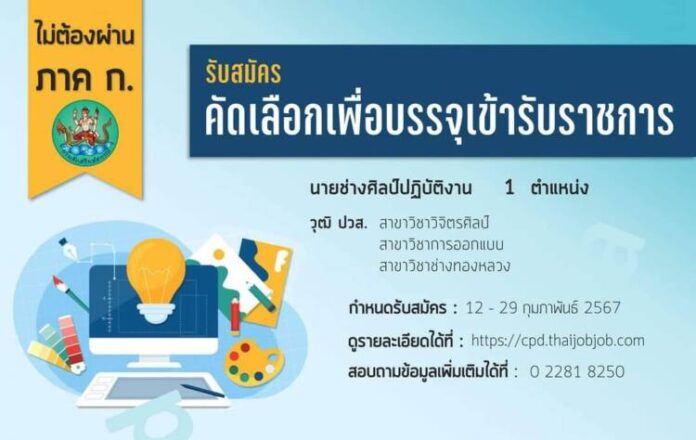 กรมส่งเสริมสหกรณ์รับสมัครคัดเลือกเพื่อบรรจุและแต่งตั้งบุคคลเข้ารับราชการในตำแหน่งนายช่างศิลป์ปฏิบัติงาน 1 ตำแหน่ง