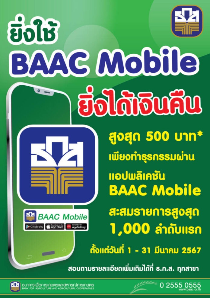 ธนาคารเพื่อการเกษตรและสหกรณ์การเกษตร (ธ.ก.ส.) จัดแคมเปญ “ยิ่งใช้ BAAC Mobile ยิ่งได้เงินคืน” เพียงทำธุรกรรมผ่านแอปพลิเคชัน BAAC Mobile สะสมรายการสูงสุดเป็น 1,000 ลำดับแรก ทั้งการถอนเงินโดยไม่ใช้บัตร การโอนเงิน การเติมเงิน การจ่ายบิล การชำระสินเชื่อ การสแกนชำระสินค้าและบริการ รวมไปถึงการฝากสลาก รับเงินคืนสูงสุด 500 บาท โดยผู้ที่มีปริมาณการทำธุรกรรมสูงสุด ลำดับที่ 1 – 100 จะได้รับเงินคืน 500 บาท/ราย ลำดับที่ 101 – 500 จะได้รับเงินคืน 300 บาท/ราย และลำดับที่ 501 – 1,000 จะได้รับเงินคืน 100 บาท/ราย ยิ่งทำธุรกรรม ยิ่งมีสิทธิ์รับเงินคืน เริ่มแล้วตั้งแต่วันที่ 1 – 31 มีนาคม 2567 โดยธนาคารจะโอนเงินคืนเข้าบัญชีเงินฝากออมทรัพย์ของลูกค้า ภายใน 45 วันทำการหลังสิ้นสุดแคมเปญ (เงื่อนไขเป็นไปตามที่ธนาคารกำหนด)
