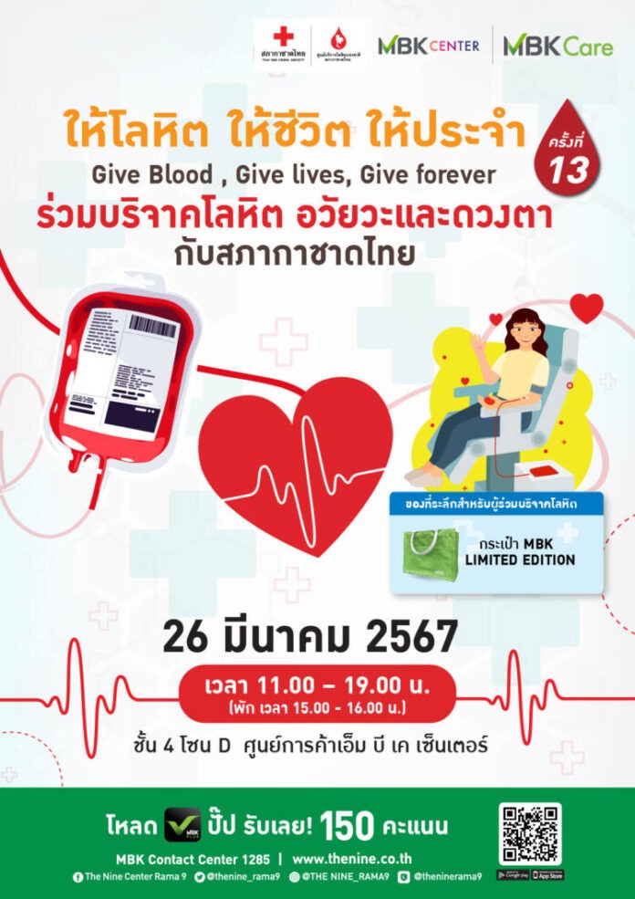 เตรียมร่างกายให้พร้อม!! ศูนย์การค้าเอ็ม บี เค เซ็นเตอร์ เชิญชวนมาเป็นผู้ให้ที่ยิ่งใหญ่ ร่วมกับ ศูนย์บริการโลหิตแห่งชาติและศูนย์รับบริจาคอวัยวะกับ สภากาชาดไทย จัดกิจกรรม ให้โลหิต ให้ชีวิต ให้ประจำ Give Blood, Give lives, Give forever ครั้งที่ 13 ในวันอังคารที่ 26 มีนาคม 2567 บริเวณชั้น 4 โซน D ตั้งแต่เวลา 11.00 น. – 19.00 น.