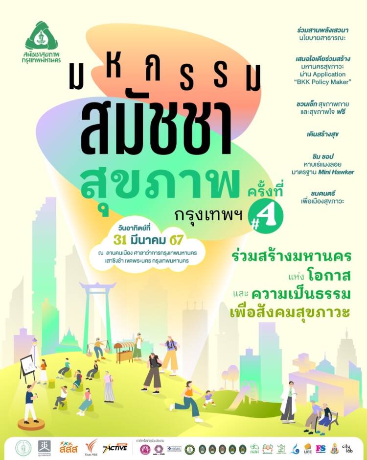 25มี.ค.67 / นายเอกวรัญญู อัมระปาล โฆษกของกรุงเทพมหานคร แจ้งว่า ในวันอาทิตย์ที่ 31 มีนาคมนี้ ที่ลานคนเมือง ศาลาว่าการกรุงเทพมหานคร (เสาชิงช้า) มีกิจกรรมห้ามพลาดที่อยากเชิญชวนประชาชนมาร่วมงานโดยไม่เสียค่าใช้จ่าย ในงานสมัชชาสุขภาพกรุงเทพมหานคร ครั้งที่ 4 พ.ศ. 2567 ภายใต้แนวคิด “ร่วมสร้างมหานครแห่งโอกาสและความเป็นธรรม เพื่อสังคมสุขภาวะ” ซึ่งกรุงเทพมหานคร และคณะกรรมการสนับสนุนการจัดและขับเคลื่อนมติสมัชชาสุขภาพกรุงเทพมหานคร ร่วมกันจัดขึ้นตลอดทั้งวัน ช่วงเวลา 06.00-19.30 น. ที่ลานคนเมือง