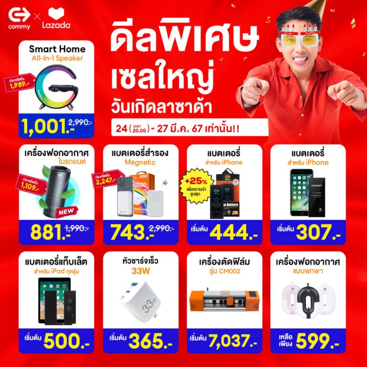 “คอมมี่” (COMMY) ผู้นำด้านการผลิต จัดจำหน่ายแบตเตอรี่และอุปกรณ์เสริมสินค้าไอที ขนแกดเจต จัดหนักจัดเต็ม ลดราคาแบบตะโกนให้ช้อปกันแบบกระหน่ำฉลองครบรอบ 12 ปีลาซาด้า ผ่านแคมเปญ “เซลใหญ่ วันเกิดลาซาด้า” พบกับสินค้า Clearance Sale ลดสูงสุดถึง 90% อาทิ “COMMY SmartHome All-In-1 Speaker” มูลค่า 1,001 บาท, “เครื่องฟอกอากาศในรถยนต์” ราคา 881 บาท, “แบตเตอรี่สำรองชาร์จไร้สาย” (Macnetic Power Bank) ราคา 743 บาท, “แบตเตอรี่สำหรับแท็บเล็ตทุกรุ่น” ราคา 500 บาท, “เครื่องตัดฟิล์ม รุ่น CM002” ราคา 7,037 บาท, “เครื่องฟอกอากาศแบบพกพา” ราคา 599 บาท, “หัวชาร์จเร็ว 33W” จ่ายไฟสูงถึง 33 วัตต์ รองรับเทคโนโลยีชาร์จด่วน ชาร์จเร็วขึ้นถึง 70% ภายใน 30 นาที ราคา 365 บาท, “แบตเตอรี่ iPhone” ราคาสุดพิเศษ เริ่มต้นเพียง 307 บาท และสินค้าอื่น ๆ อีกมากมาย