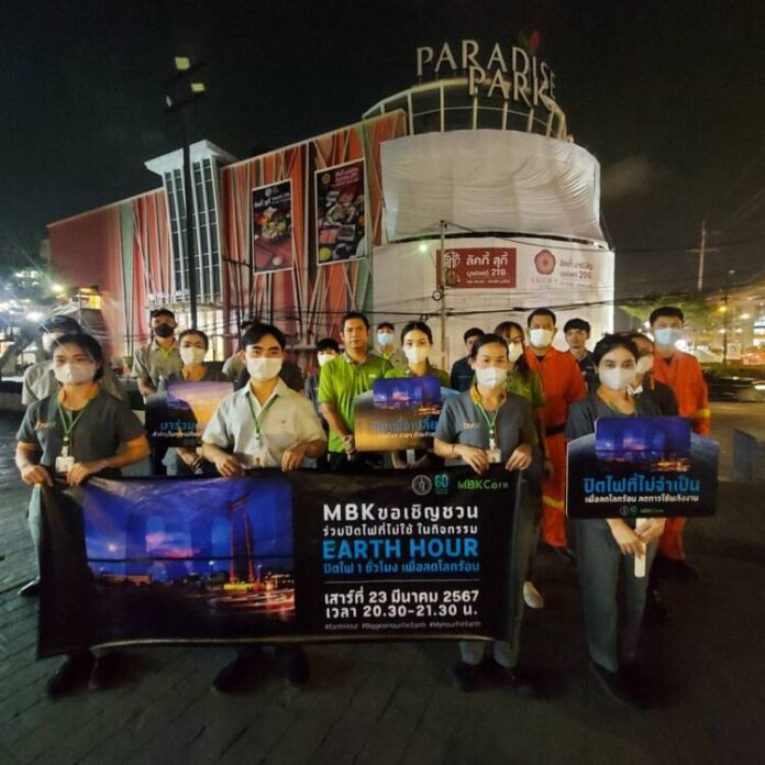 บริษัท เอ็ม บี เค จำกัด (มหาชน) และธุรกิจในเครือ แสดงพลังรักษ์โลก ช่วยชาติประหยัดพลังงาน และลดโลกร้อน โดยผนึก กรุงเทพมหานคร และภาคีเครือข่าย ร่วมแสดงเจตนารมณ์และให้ความสำคัญในการแก้ปัญหาโลกร้อน ด้วยการลดใช้พลังงาน กับกิจกรรม “ปิดไฟ 1 ชั่วโมง” เพื่อลดโลกร้อน ปี 2567 (60+ Earth Hour 2024) ปิดไฟดวงที่ไม่จำเป็น พร้อมกัน 1 ชั่วโมง พร้อมกับเมืองต่าง ๆ กว่า 7,000 เมือง ใน 190 ประเทศทั่วโลก เมื่อวันเสาร์ที่ 23 มีนาคม 2567 เวลา 20.30 น.– 21.30 น. ที่ผ่านมา ที่บริเวณรอบศูนย์การค้า โรงแรม และอาคารสำนักงานกลุ่มธุรกิจในเครือเอ็ม บี เค กว่า 15 อาคาร อาทิ ศูนย์การค้าเอ็ม บี เค เซ็นเตอร์ พาราไดซ์ พาร์ค เดอะไนน์ เซ็นเตอร์ พระราม 9 เดอะไนน์ เซ็นเตอร์ ติวานนท์ โรงแรมปทุมวันปริ๊นเซส โรงแรมทินิดี โฮเต็ล บางกอก กอล์ฟ คลับ โรงแรมลยานะ รีสอร์ท แอนด์ สปา อาคารกลาสเฮ้าส์ รัชดา คอนโด ควินน์ รัชดา 17 คอนโด ควินน์ สุขุมวิท 101 เป็นต้น