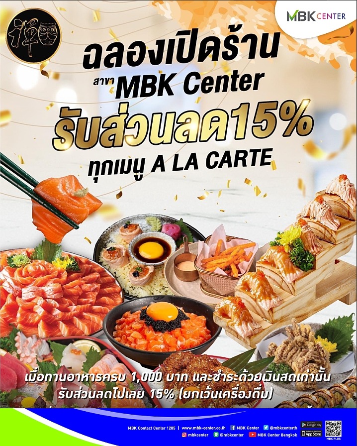 ขยายโปรโมชัน!! ฟินฉ่ำๆ เฉพาะสาขาเอ็ม บี เค เซ็นเตอร์ สาขาใหม่ล่าสุดของ FUKU INTOWN ตั้งอยู่ที่ชั้น 3 โซน A เมื่อรับประทานอาหารครบ 1,000 บาท และชำระด้วยเงินสด รับส่วนลดทันที 15 % ทุกเมนู A La Carte (ยกเว้นเครื่องดื่ม) ตั้งแต่วันนี้ – วันอาทิตย์ที่ 7 เมษายนนี้เท่านั้น