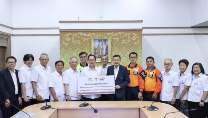 นพ.ดร.พรเทพ ศิริวนารังสรรค์ (ที่ 7 จากซ้าย) ประธานกรรมการ มูลนิธิการแพทย์ฉุกเฉินแห่งชาติ ในพระราชูปถัมภ์ รับมอบเงินบุญนิธิแสตมป์เซเว่นฯ เพื่อสาธารณกุศลทั่วประเทศ ซึ่งมาจากการบริจาคแสตมป์ของลูกค้าทั่วประเทศในรอบปีที่ผ่านมา จำนวน 600,000 บาท จากนายณรงค์ศักดิ์ ภูมิศรีสอาด (ที่ 9 จากซ้าย) ที่ปรึกษาคณะเจ้าหน้าที่บริหาร บริษัท ซีพี ออลล์ จำกัด (มหาชน) เพื่อนำไปจัดหาเครื่องกระตุกคลื่นไฟฟ้าหัวใจอัตโนมัติ หรือ Automatic External Defibrillator (AED) จำนวน 10 เครื่อง นำมาติดตั้งในพื้นที่ที่มีความเสี่ยงเกิดเหตุการณ์ฉุกเฉินบ่อยๆ ได้ใช้ช่วยชีวิตผู้ป่วยที่หมดสติจากอาการทางหัวใจ ซึ่งเป็นประโยชน์ให้กับสังคมและชุมชนต่อไป ตามปณิธานองค์กร “Giving and Sharing” ณ มูลนิธิการแพทย์ฉุกเฉินแห่งชาติ อ.เมือง จ.นนทบุรี เมื่อเร็วๆ นี้