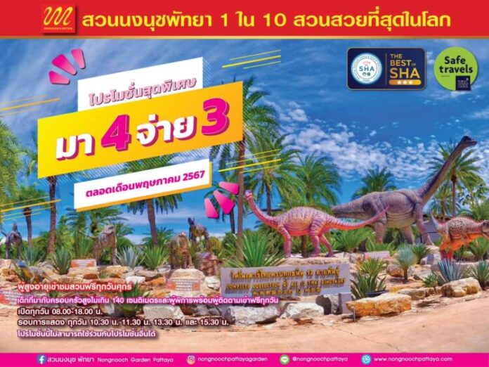 สวนนงนุชพัทยา โดย นายกัมพล ตันสัจจา ประธานสวนนงนุชพัทยา จัดโปรโมชั่นเดือนพฤษภาคม สำหรับการท่องเที่ยวแบบไทยเที่ยวไทย ผู้ซื้อบัตรผ่านประตู มา 4 ท่าน จ่ายเพียง 3 ท่าน เด็กที่มีความสูงไม่เกิน 140 ซม. ที่มากับครอบครัวและผู้พิการ พร้อมผู้ติดตามเข้าฟรีทุกวัน ผู้สูงอายุเที่ยวชมสวนฟรี ทุกวันศุกร์ สำหรับท่านที่สนใจชมการแสดงนงนุชโชว์และการแสดงของน้องช้างแสนรู้ สามารถซื้อบัตรเพิ่มเติมได้ มีการแสดงวันละ 4 รอบ เช้า 2 รอบ บ่าย 2 รอบ โรงละครสกาล่านงนุชพัทยา สามารถรองรับนักท่องเที่ยวได้ถึง 2,030 ที่นั่งและผู้ที่ชื่นชอบการถ่ายภาพสามารถนั่งรถชมสวนสวยมากกว่า 50 สวน บนพื้นที่ 1,700 ไร่