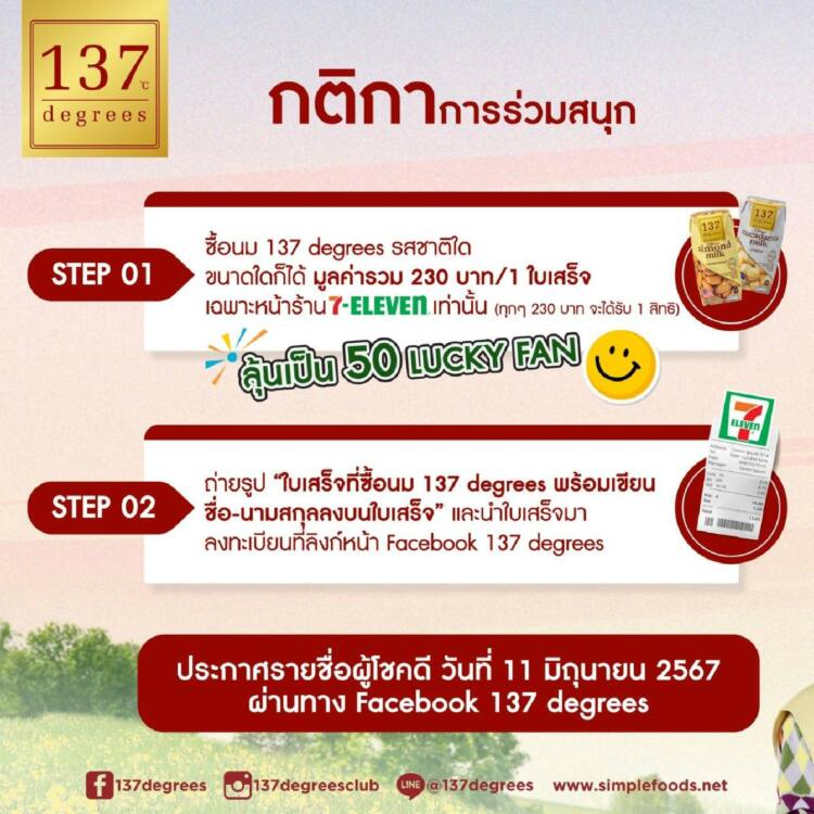 - ซื้อนม 137Degreesรสชาติใดก็ได้ มูลค่ารวม 230 บาทต่อ 1 ใบเสร็จ ตั้งแต่วันที่ 1 พฤษภาคม 2567 – 31 พฤษภาคม 2567 ที่ร้าน 7-Eleven เฉพาะหน้าร้านเท่านั้น (7-Eleven delivery และ 7-Eleven online ไม่ร่วมรายการ)
