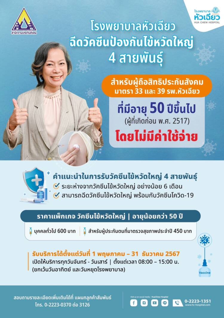 โรงพยาบาลหัวเฉียว ขอเชิญชวนผู้ประกันตนในระบบประกันสังคมมาตรา 33 และ 39 รพ.หัวเฉียว ที่มีอายุ 50 ปีขึ้นไป (ผู้ที่เกิดก่อน พ.ศ. 2517) เข้ารับวัคซีนป้องกันไข้หวัดใหญ่ 4 สายพันธุ์ โดยไม่มีค่าใช้จ่าย!!