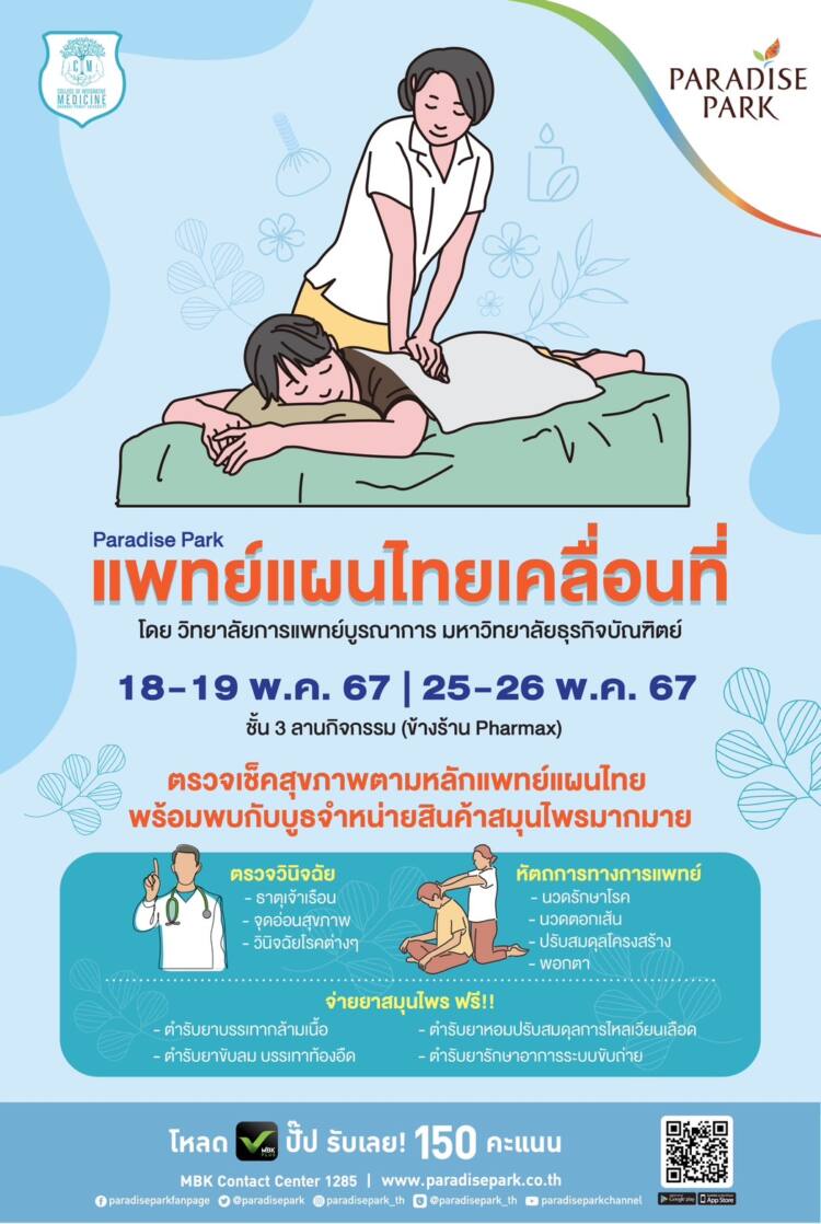 พาราไดซ์ พาร์ค ศูนย์การค้าในเครือเอ็ม บี เค ร่วมส่งเสริมศาสตร์การแพทย์ แผนไทยอย่างต่อเนื่อง จัดงาน พาราไดซ์ พาร์ค แพทย์แผนไทยเคลื่อนที่ โดย วิทยาลัยการแพทย์บูรณาการ มหาวิทยาลัยธุรกิจบัณฑิตย์ ชวนคุณมาตรวจเช็คสุขภาพตามหลั กแพทย์แผนไทย ทั้งการตรวจธาตุเจ้าเรือน เช็คจุดอ่อนของสุขภาพ เพื่อวินิจฉัยโรคต่าง ๆ การทำหัตถการทางการแพทย์ นวดรักษาโรค นวดตอกเส้น ปรับสมดุลโครงสร้าง พอกตา และการจ่ายยาสมุนไพร ฟรี ! เช่น ตำรับยาบรรเทากล้ามเนื้อ ตำรับยาขับลม บรรเทาท้องอืด ตำรับยาหอมปรับสมดุลการไหลเวี ยนเลือด ตำรับยารักษาอาการระบบขับถ่าย ตลอดจนการให้คำแนะนำในการดูแลสุ ขภาพภายใต้การดูแลของผู้มี ใบประกอบโรคศิลปะทางการแพทย์ แผนไทย นอกจากนี้ในงานยังมีบูธจำหน่ ายสินค้าสมุนไพรอีกด้วย