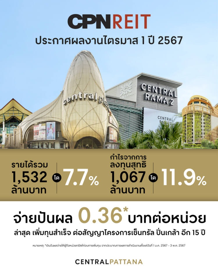 นางสาวปัทมิกา พงศ์สูรย์มาส ประธานเจ้าหน้าที่บริหาร บริษัท ซีพีเอ็น รีท แมเนจเมนท์ จำกัด ในฐานะผู้จัดการกองทรัสต์ CPNREIT กล่าวว่า กองทรัสต์ CPNREIT มีผลการดำเนินงานเติบโตต่อเนื่อง สอดคล้องกับการฟื้นตัวของธุรกิจค้าปลีกและภาคการท่องเที่ยวไทย โดยธุรกิจศูนย์การค้าที่เป็นธุรกิจหลักของกองทรัสต์ CPNREIT ลงทุนอยู่ในปัจจุบันทั้ง 7 โครงการ มีการฟื้นตัวกลับมาได้อย่างรวดเร็ว และมีผลการดำเนินงานที่โดดเด่น โดยภาพรวมไตรมาส 1 ปี 2567 ทรัพย์สินที่กองทรัสต์ CPNREIT ลงทุนอยู่ในปัจจุบันมีอัตราการเช่าพื้นที่เฉลี่ยของของศูนย์การค้าและอาคารสำนักงานอยู่ในระดับสูงอยู่ที่ประมาณ 93% มีจำนวนผู้มาใช้บริการศูนย์การค้าเฉลี่ยเพิ่มขึ้น 8% จากช่วงเดียวกันของปีก่อนหน้า สะท้อนการบริโภคภายในประเทศที่ปรับตัวดีขึ้นและการจับจ่ายใช้สอยของนักท่องเที่ยว ส่งผลให้กองทรัสต์มีรายได้รวมจำนวน 1,532 ล้านบาท เพิ่มขึ้น 7.7% จากปีก่อน และมีกำไรจากการลงทุนสุทธิ 1,067 ล้านบาท เติบโต 11.9% จากปีก่อน อย่างไรก็ดี เมื่อวันที่ 5 เมษายน 2567 ผู้จัดการกองทรัสต์ได้ประกาศจ่ายปันผลให้กับผู้ถือหน่วยทรัสต์เดิมก่อนการเพิ่มทุน จากประมาณการผลการดำเนินงานตั้งแต่วันที่ 1 มกราคม – 3 พฤษภาคม 2567 ในอัตรา 0.3618 บาทต่อหน่วย โดยกำหนดจ่ายประโยชน์ตอบแทนในวันที่ 17 พฤษภาคม 2567