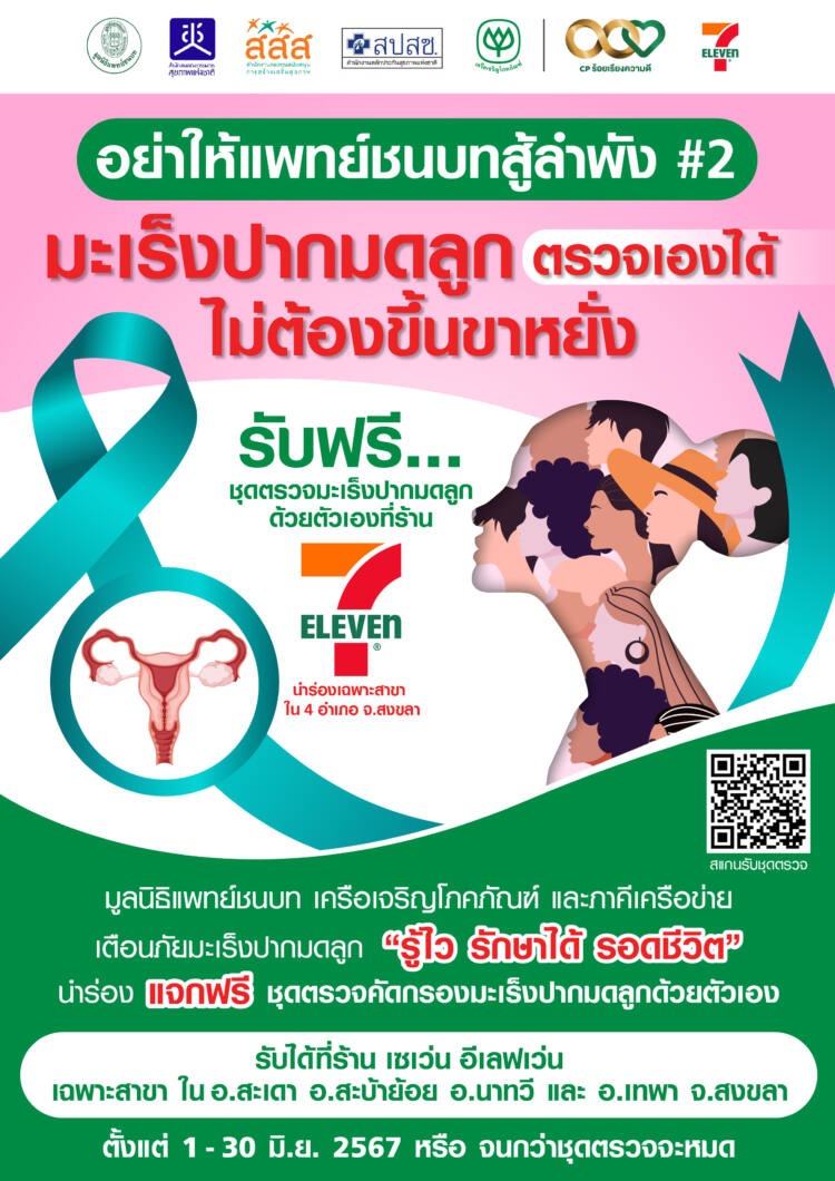 มูลนิธิแพทย์ชนบท จึงร่วมกับเครือเจริญโภคภัณฑ์ (ซีพี) บมจ.ซีพีออลล์ สำนักงานคณะกรรมการสุขภาพแห่งชาติ (สช.) สำนักงานกองทุนสนับสนุนการสร้างเสริมสุขภาพ (สสส.) และสำนักงานหลักประกันสุขภาพแห่งชาติ (สปสช.) รณรงค์เตือนภัยให้หญิงไทยตระหนักและเห็นถึงความสำคัญของการตรวจคัดกรองมะเร็งปากมดลูกภายใต้แนวคิด “รู้ไว รักษาได้ รอดชีวิต” นำร่องแจกฟรี ชุดตรวจคัดกรองมะเร็งปากมดลูกด้วยตัวเอง HPV Self Test รวม 12,000 ชุด สามารถลงทะเบียนรับสิทธิในแอปพลิเคชันเป๋าตังและมารับได้ที่เซเว่น อีเลฟเว่นเฉพาะใน 4 อำเภอ จ.สงขลา ได้แก่ อ.สะเดา อ.สะบ้าย้อย อ.นาทวีและ อ.เทพา ตั้งแต่วันที่ 1-30 มิถุนายน 2567 หรือ จนกว่าชุดตรวจจะหมด