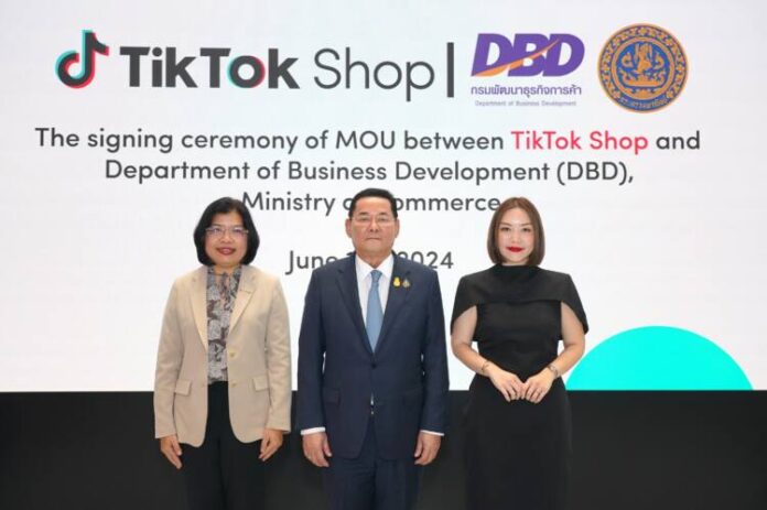 [กรุงเทพฯ ประเทศไทย] – [12 มิถุนายน 2567] – TikTok Shop โซลูชันอีคอมเมิร์ซชั้นนําในเอเชียตะวันออกเฉียงใต้ เดินหน้าส่งเสริมนโยบายเศรษฐกิจดิจิทัล (Digital Economy) ของประเทศไทย ประกาศลงนามบันทึกข้อตกลงความร่วมมือ (MoU) ร่วมกับ กรมพัฒนาธุรกิจการค้า กระทรวงพาณิชย์ (DBD) สานต่อพันธกิจสำคัญ 3 ด้านที่มุ่งมั่นยกระดับศักยภาพธุรกิจท้องถิ่นในภูมิภาคเอเชียตะวันออกเฉียงใต้ผ่านแพลตฟอร์ม TikTok Shop อย่างยั่งยืน ได้แก่ 1) สนับสนุนธุรกิจท้องถิ่น เพื่อปลดล็อกโอกาสยุคเศรษฐกิจดิจิทัล 2) ขยายศักยภาพการเข้าถึงการเรียนรู้และการพัฒนาตนเองบนแพลตฟอร์ม TikTok Shop และ 3) สร้าง Community เพื่อรองรับและพัฒนาไปสู่ Smart Economy โดยภายใต้ความร่วมมือนี้ TikTok Shop ตั้งเป้าฝึกอบรมเพื่อเพิ่มทักษะการทำตลาดดิจิทัลรับเทรนด์ Shoppertainment แก่ผู้ประกอบการ SMEs ไทยทั้งสิ้นประมาณ 7,000 ราย ภายในปี 2567 ผ่านกิจกรรมเวิร์กช็อปทั้งแบบออนไลน์และออฟไลน์