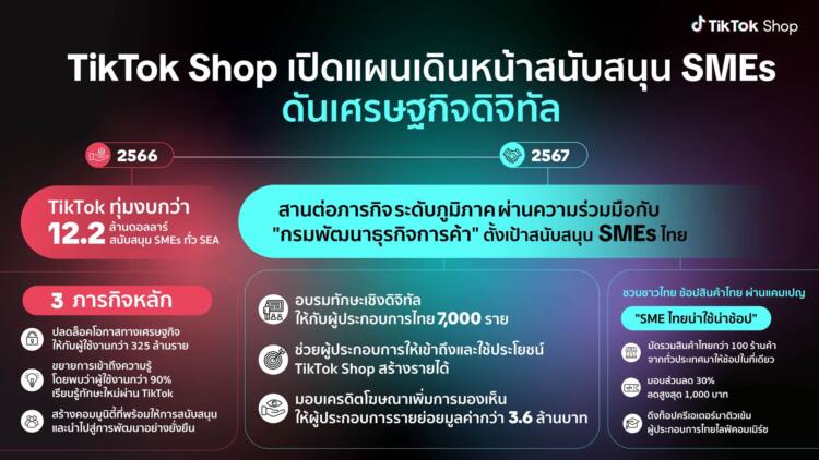 ปัจจุบันมีสินค้า SMEs จำนวนมาก จำหน่ายอยู่บน TikTok Shop จากการดำเนินโครงการร่วมกันในระยะแรก และนอกจากการมอบทักษะดิจิทัลแล้ว TikTok Shop ยังให้เครดิตการโฆษณามูลค่า 100,000 ดอลลาร์ (หรือประมาณ 3.6 ล้านบาท) ให้กับ DBD และให้การสนับสนุนในด้านต่าง ๆ กับ SMEs อย่างต่อเนื่อง อาทิ จัดอบรม Live Streaming โดยชวน SMEs ไทย 10 ราย ได้แก่ B-Garlic กระเทียมดำ, Petsmile By Dr.patty55, พี่เน่ โอเรียนทอล คอฟฟี่, Pick Me Please, Sawadee Farm, ฟ้าก็อตซิลล๊าา, teyasogood, Hugvillages, mohhomphrae, Roy’s Delivery มา Live ขายของร่วมกับเหล่า 2 TikTok Creators คือ คุณลอเรน (jirawatvongdilokv) และคุณเอื้อ (aueaim888) เรียนรู้ทักษะและรับประสบการณ์จริงในการ Live ให้ปัง ผ่านช่อง TikTokShop_TH