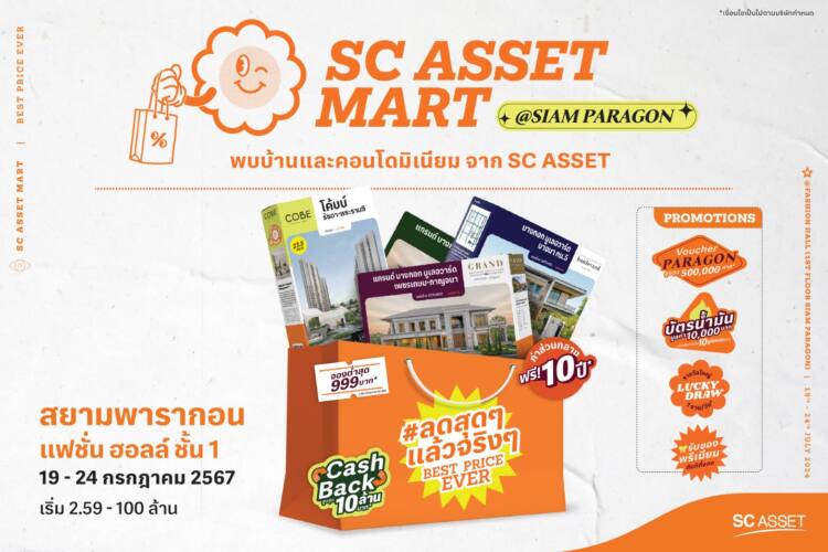SC ASSET เตรียมจัดแคมเปญใหญ่ ลดสุดๆ แล้วจริงๆ ในงาน “SC ASSET MART” พบกับกว่า 70 โครงการบ้านหรูแบรนด์ยอดนิยม และ คอนโดมิเนียมทำเลศักยภาพ ในราคาเริ่มต้น 2.59 – 100 ล้านบาท พร้อมโปรโมชั่นพิเศษการันตีราคาดีที่สุดแห่งปี จัดเต็มให้สุดๆกับ Cash Back รับเงินคืนสูงสุดถึง 10 ล้าน* ฟรี! ค่าส่วนกลางสูงสุดนาน 10 ปี* จองต่ำสุด 999 บาท* บัตรกำนัล สยามพารากอน มูลค่า สูงสุดถึง 500,000 บาท* อีกทั้งบัตรน้ำมัน มูลค่า 10,000 บาท* นอกจากนั้นยังมีการจับรางวัลใหญ่ LUCKY DRAW 1 รางวัลทุกวัน* และรับของพรีเมียมทันทีที่จองโครงการ* (*เงื่อนไขเป็นไปตามที่บริษัทฯ กำหนด) โอกาสเดียวที่ไม่ควรพลาด 19 – 24 กรกฏาคม 2567 นี้ ณ แฟชั่น ฮอลล์ ชั้น 1 สยามพารากอน สอบถามรายละเอียดเพิ่มเติมได้ที่ https://m.scasset.com/Mnqn หรือโทร. 1789 และ Line: @SCASSET (https://lin.ee/qYk6oOC) บอกเลย งานนี้ห้ามพลาด!!!