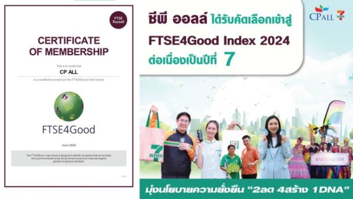 บริษัท ซีพี ออลล์ จำกัด (มหาชน) ผู้บริหารเซเว่น อีเลฟเว่น และเซเว่น เดเวอรี่ ได้รับเลือกเป็นสมาชิกดัชนีความยั่งยืนระดับโลก FTSE4Good Index ประจำปี 2024 ในกลุ่ม Food Retailers & Wholesalers ต่อเนื่องเป็นปีที่ 7 แล้ว (2018 – 2024) โดยมี ESG Rating รวมทั้งคะแนนด้านสิ่งแวดล้อมเพิ่มสูงขึ้นจากปีก่อน และในภาพรวมทุกๆ มิติ ยังคงมีคะแนนสูงกว่าค่าเฉลี่ยอุตสาหกรรม (Industry Average) ทั้งหมด