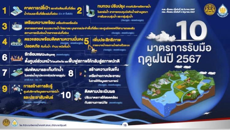 “สทนช. ได้เน้นย้ำให้หน่วยงานที่เกี่ยวข้องบูรณาการทำงานร่วมกันอย่างเป็นระบบ และเฝ้าติดตามสถานการณ์น้ำอย่างใกล้ชิดตลอดช่วงฤดูฝนนี้ เพื่อป้องกันและลดผลกระทบที่อาจจะเกิดขึ้นกับประชาชนให้เหลือน้อยที่สุด และที่สำคัญจะต้องปฏิบัติตาม 10 มาตรการรับมือฤดูฝน ปี 2567 ของรัฐบาลอย่างเคร่งครัด พร้อมทั้งเร่งเดินหน้าสร้างความเข้มแข็งให้กับเครือข่ายภาคประชาชน ตลอดจนการดำเนินการประชาสัมพันธ์สร้างการรับรู้เกี่ยวกับข้อมูลสถานการณ์น้ำอย่างถูกต้องและต่อเนื่อง เพื่อให้การป้องกันและบรรเทาอุทกภัยปีนี้เกิดประสิทธิภาพสูงสุด” เลขาธิการ สทนช. กล่าวย้ำในตอนท้าย