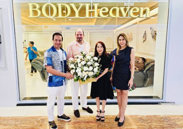 นางสาวสหัพย์ภัค โชควิจิตรกุล (ที่ 3 จากซ้าย) กรรมการผู้จัดการศูนย์การค้าเอ็ม บี เค เซ็นเตอร์ พร้อมด้วย นางสาวชวรมย์ มังคละคีรี (ที่ 4 จากซ้าย) ผู้อำนวยการฝ่ายผู้เช่าสัมพันธ์กลางและสนับสนุนการขาย บริษัท เอ็ม บี เค จำกัด (มหาชน) มอบกระเช้าดอกไม้แสดงความยินดีแก่ นายซาเมห์ ชอว์กัต (Sameh Shawkat) (ที่ 1 จากซ้าย) และ นายแอมโร เมกกะวี (Amro Mekkawy) (ที่ 2 จากซ้าย) เนื่องในโอกาสเปิดร้านใหม่ BODY Heaven บริการนวดผ่อนคลาย นวดไทย สปาเท้า ณ ชั้น 5 โซน B ศูนย์การค้าเอ็ม บี เค เซ็นเตอร์ เมื่อเร็ว ๆ นี้