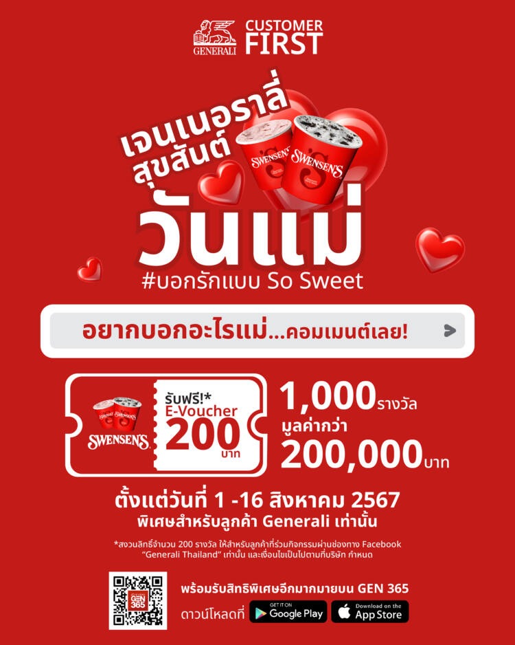 ใกล้ถึงวันแม่แล้ว เจนเนอราลี่ ไทยแลนด์ เตรียมจัดกิจกรรม “#บอกรักแบบ So Sweet” อีกหนึ่งกิจกรรมพิเศษ ภายใต้แคมเปญ ‘Customer FIRST’ เพื่อมอบประสบการณ์สุดเอ็กซ์คลูซีฟ เป็นของขวัญให้ลูกค้า เจนเนอราลี่ ได้พาคุณแม่ ไปร่วมฉลองเติมเต็มความสุขในครอบครัวกับการรับประทานไอศกรีม ที่ร้าน สเวนเซ่นส์ (Swensen’s) มูลค่า 200 บาท จำนวนทั้งสิ้น 1,000 สิทธิ์ รวมมูลค่ากว่า 200,000 บาท เริ่มตั้งแต่วันที่ 1-16 สิงหาคม 2567