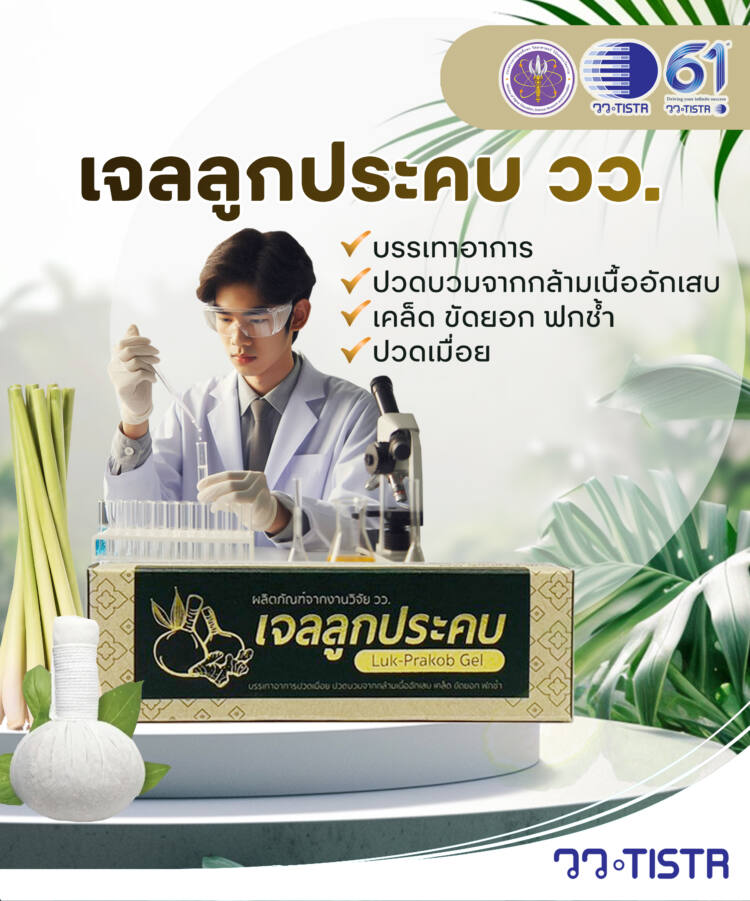 จากโจทย์ดังกล่าว สถาบันวิจัยวิทยาศาสตร์และเทคโนโลยีแห่งประเทศไทย (วว.) กระทรวงการอุดมศึกษา วิทยาศาสตร์ วิจัยและนวัตกรรม (อว.) โดย ศูนย์เชี่ยวชาญนวัตกรรมผลิตภัณฑ์สมุนไพร จึงได้ดำเนินการวิจัยและพัฒนา “เจลลูกประคบ : Luk Prakob Gel” ซึ่งเป็นผลิตภัณฑ์รูปแบบใหม่จากสมุนไพรไทย