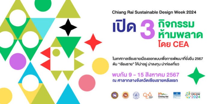 มาร่วมเป็นส่วนหนึ่งออกแบบเมืองเชียงรายให้เป็นเมืองที่น่าอยู่ น่าลงทุน และน่าท่องเที่ยว ผ่านการนำเสนอผลงานจาก CEA ใน “Chiang Rai Sustainable Design Week 2024” หรือ “เทศกาลเชียงรายเมืองออกแบบเพื่อการพัฒนาที่ยั่งยืน 2567” ในวันที่ 9 – 15 สิงหาคม 2567 เวลา 13.00 – 21.00 น. ณ ศาลากลางหลังแรก จังหวัดเชียงราย
