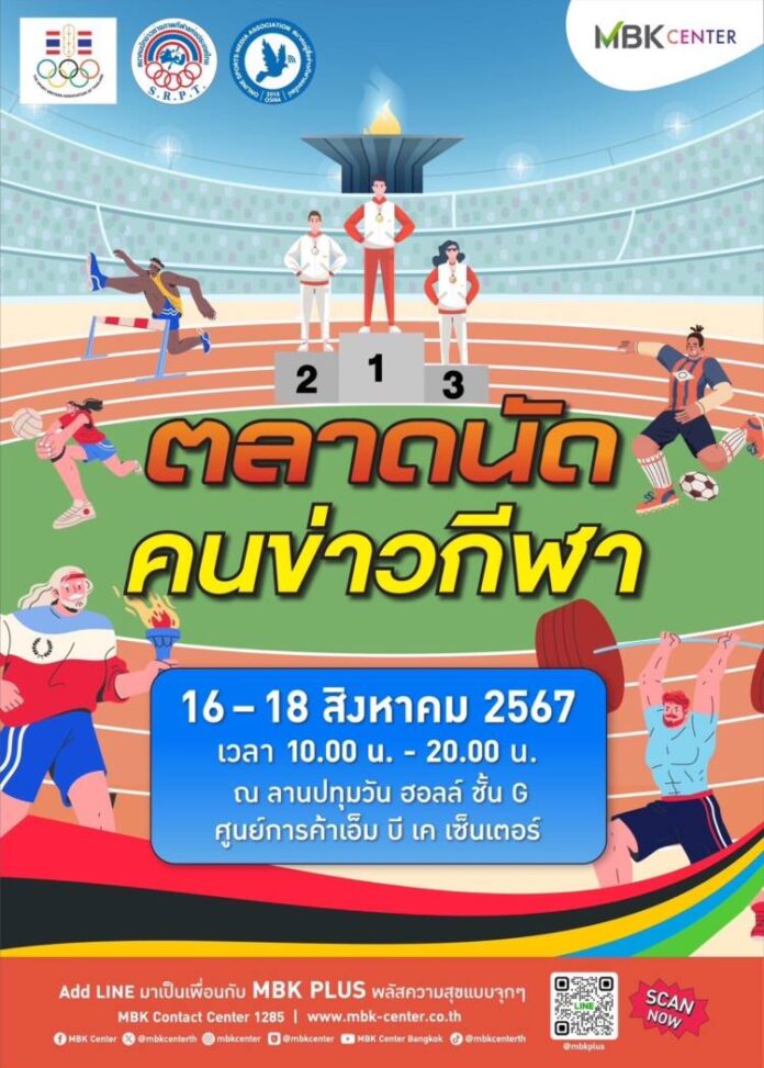 กลับมาอีกครั้งให้ช้อปกันจุ ใจใกล้ชิดนักข่าวและนักกี ฬาในดวงใจ ศูนย์การค้าเอ็ม บี เค เซ็นเตอร์ ร่วมกับ สมาคมผู้สื่อข่าวกีฬาแห่ งประเทศไทย สมาคมนักข่าวช่างภาพกีฬาแห่ งประเทศไทย และ สมาคมผู้สื่อข่าวกีฬาออนไลน์ จัดงาน ตลาดนัดคนข่าวกีฬา ปีที่ 3 เพื่อสนับสนุนการสร้างรายได้ เสริมให้กับนักข่าวกี ฬาและครอบครัวได้มีพื้นที่จำหน่ ายสินค้ าของตนเองและแสดงความสามารถด้ านอื่น ๆ อาทิ การทำอาหาร งานประดิษฐ์ ระหว่างวันศุกร์ที่ 16 – วันอาทิตย์ที่ 18 สิงหาคม 2567 บริเวณลานกิจกรรมปทุมวัน ฮอลล์