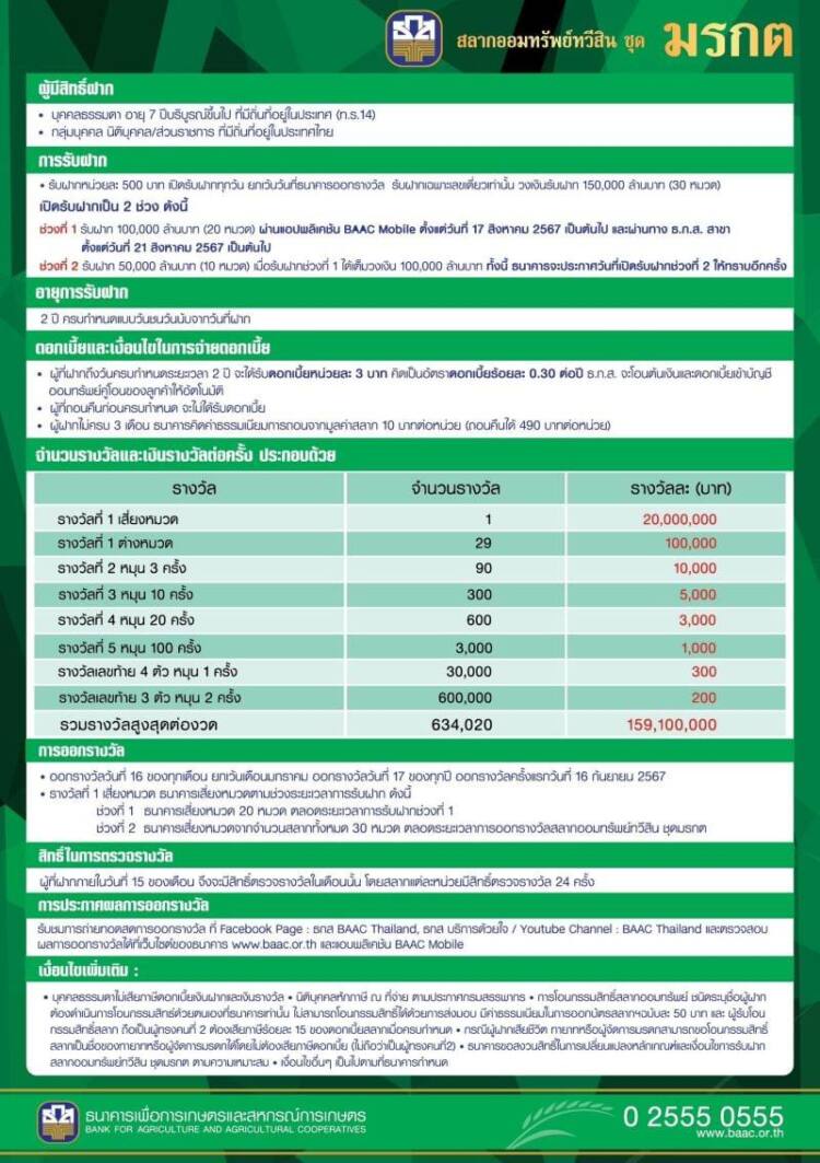ธ.ก.ส. ขอขอบคุณลูกค้าและผู้มีอุปการคุณทุกท่านที่ให้ความไว้วางใจและสนับสนุนผลิตภัณฑ์เงินฝากของธนาคาร ซึ่งธนาคารจะนำเงินดังกล่าวไปสนับสนุนเกษตรกรในการลงทุนและการผลิตในภาคการเกษตร เพื่อสร้างความแข็งแกร่งให้ระบบเศรษฐกิจและความมั่นคงทางด้านอาหารให้กับประเทศต่อไป ซึ่งสลากออมทรัพย์ทวีสิน ชุดมรกต มีอายุการรับฝาก 2 ปี เมื่อฝากครบกำหนด จะได้รับดอกเบี้ยหน่วยละ 3 บาท คิดเป็นอัตราดอกเบี้ย ร้อยละ 0.30 ต่อปี และมีสิทธิ์ลุ้นรางวัลที่ 1 เสี่ยงหมวด มูลค่า 20,000,000 บาทและรางวัลอื่นๆ จำนวน 634,020 รางวัล เป็นเงิน 159,100,000 บาทต่อเดือน จำนวน 24 ครั้ง ได้แก่ รางวัลที่ 1 ต่างหมวด จำนวน 29 รางวัล รางวัลละ 100,000 บาท รางวัลที่ 2 จำนวน 90 รางวัล รางวัลละ 10,000 บาท รางวัลที่ 3 จำนวน 300 รางวัล รางวัลละ 5,000 บาท รางวัลที่ 4 จำนวน 600 รางวัล รางวัลละ 3,000 บาท รางวัลที่ 5 จำนวน 3,000 รางวัล รางวัลละ 1,000 บาท รางวัลเลขท้าย 4 ตัว จำนวน 30,000 รางวัล รางวัลละ 300 บาท และรางวัลเลขท้าย 3 ตัว จำนวน 600,000 รางวัล รางวัลละ 200 บาท ทั้งนี้ เมื่อฝากสลากฯ 500,000 บาทขึ้นไป การันตีผลตอบแทน 400 บาทต่อเดือน ผลตอบแทนรวมเมื่อครบกำหนด 12,600 บาท และยังได้รับการยกเว้นภาษีสำหรับบุคคลธรรมดาและนำไปใช้เป็นหลักประกันเงินกู้ของ ธ.ก.ส. ได้อีกด้วย