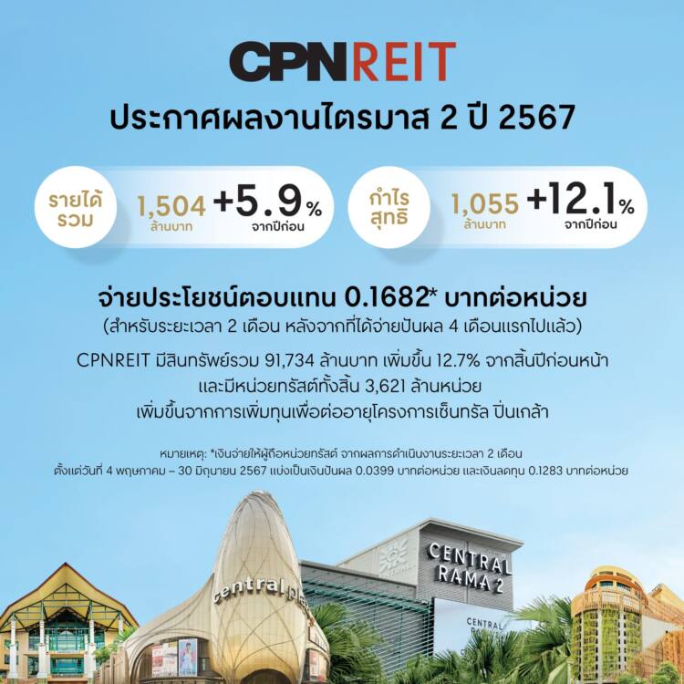 นางสาวปัทมิกา พงศ์สูรย์มาส ประธานเจ้าหน้าที่บริหาร บริษัท ซีพีเอ็น รีท แมเนจเมนท์ จำกัด ในฐานะผู้จัดการกองทรัสต์ CPNREIT กล่าวว่า กองทรัสต์ CPNREIT มีผลการดำเนินงานเติบโตต่อเนื่อง สอดคล้องกับการขยายตัวต่อเนื่องของการบริโภคภาคเอกชน ภาคบริการ การจ้างงาน ที่ได้รับแรงขับเคลื่อนจากภาคการท่องเที่ยว โดยภาพรวมไตรมาส 2 ปี 2567 ทรัพย์สินที่กองทรัสต์ CPNREIT ลงทุนอยู่ในปัจจุบัน ได้แก่ ศูนย์การค้า 7 โครงการ และอาคารสำนักงาน 4 อาคาร มีอัตราการเช่าพื้นที่เฉลี่ยรวมอยู่ในระดับสูงที่ประมาณ 93% และจำนวนผู้มาใช้บริการศูนย์การค้าเฉลี่ยคงระดับเดียวกับไตรมาสก่อนหน้า รายได้ค่าเช่าจากธุรกิจศูนย์การค้าเติบโต 5.9% จากช่วงเดียวกันของปีก่อน และรายได้จากธุรกิจอาคารสำนักงานเพิ่มขึ้น 7.1% จากช่วงเดียวกันของปีก่อน อีกทั้งรายได้ค่าเช่าจากธุรกิจโรงแรมปรับเพิ่มขึ้นตามสัญญา ส่งผลให้กองทรัสต์มีรายได้รวมจำนวน 1,504 ล้านบาท เพิ่มขึ้น 5.9% จากช่วงเดียวกันปีก่อน และมีกำไรจากการลงทุนสุทธิ 1,055 ล้านบาท เติบโต 12.1% จากช่วงเดียวกันปีก่อน นอกจากนี้ CPNREIT มีสินทรัพย์รวม 91,734 ล้านบาท เพิ่มขึ้น 12.7% จากสิ้นปีก่อนหน้า เป็นผลจากการต่อสัญญาโครงการเซ็นทรัล ปิ่นเกล้า เรียบร้อยแล้วเมื่อต้นเดือนพฤษภาคมที่ผ่านมา และมีหน่วยทรัสต์ทั้งสิ้น 3,621 ล้านหน่วย เพิ่มขึ้นจากการออกหน่วยทรัสต์เพิ่มทุนจำนวน 1,053 ล้านหน่วย