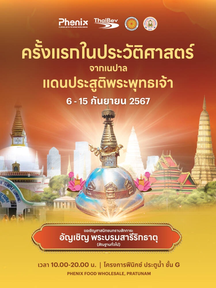 สภาศิลปินส่งเสริมพระพุทธศาสนาแห่งประเทศไทย และหน่วยเผยแพร่ศีลธรรมทางพระพุทธศาสนา (นศพ.) กรมศาสนา กระทรวงวัฒนธรรม ร่วมกับ โครงการ Phenix (ฟีนิกซ์) แหล่งรวมอาหารและสุดยอดความอร่อยใจกลางเมืองย่านประตูน้ำ ภายใต้ บริษัท แอสเสท เวิรด์ คอร์ป จำกัด (มหาชน) ขอเชิญพุทธศาสนิกชนร่วมสักการะพระบรมสารีริกธาตุ ครั้งแรกในประวัติศาสตร์ของประเทศไทย ในการอัญเชิญพระบรมสารีริกธาตุสัณฐานทั่วไป จากวัดมหาปชาบดีโคตมี ใกล้ลุมพินีสถาน ประเทศเนปาล อันเป็นดินแดนประสูติของพระพุทธเจ้า มาประดิษฐาน เพื่อเสริมสิริมงคลแก่ประชาชน และประเทศชาติ