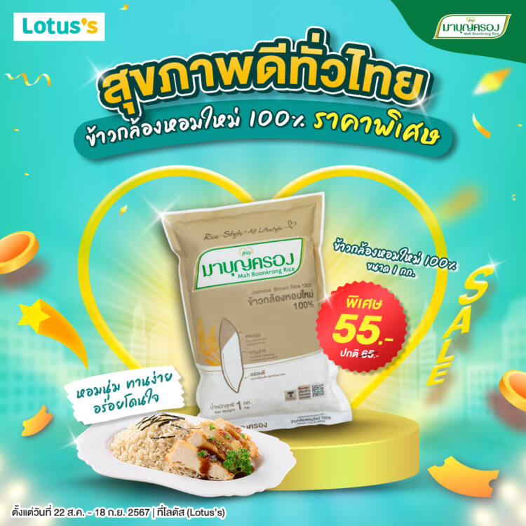 ข้าวมาบุญครอง  จัดโปรโมชันสุดพิเศษ มอบสุขภาพดีให้ลูกค้าทั่วไทย กับผลิตภัณฑ์ข้าวกล้องหอมใหม่ 100% ขนาด กิโลกรัม คัดสรรข้าวกล้องคุณภาพดีคัดพิเศษ สดใหม่เพราะเก็บเกี่ยวไม่เกิน เดือน สัมผัสความสดใหม่ หอมนุ่ม ละมุนลิ้น ในราคาพิเศษเพียง 55 บาท จากปกติ 65 บาท ที่โลตัส (Lotus’s) และโลตัสออนไลน์  (Lotus’s Online)  ตั้งแต่วันนี้  – 18 กันยายน 2567