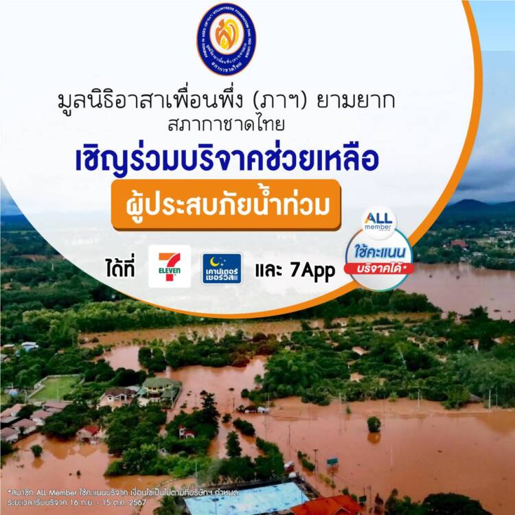 16ก.ย.2567/ จากวิกฤตอุทกภัยที่เกิดขึ้นในภาคเหนือ ทางมูลนิธิอาสาเพื่อนพึ่ง (ภาฯ) ยามยาก สภากาชาดไทย ร่วมกับ บริษัทซีพี ออลล์ จำกัด (มหาชน) ผู้บริหารเซเว่น อีเลฟเว่น และเซเว่น เดลิเวอรี่ บริษัทเคาน์เตอร์เซอร์วิส จำกัด อำนวยความสะดวกให้ประชาชนที่มีความประสงค์จะส่งกำลังใจ ช่วยเหลือผู้ประสบอุทกภัย โดยสามารถบริจาคเงินเพื่อร่วมส่งน้ำใจสู่พี่น้อง ผู้ประสบอุทกภัยผ่านเคาน์เตอร์เซอร์วิสในร้านเซเว่น อีเลฟเว่น หรือร้านค้าที่มีสัญลักษณ์เคาน์เตอร์เซอร์วิสทั่วประเทศ