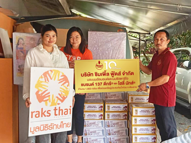 บริษัท ซิมเพิ้ล ฟู้ดส์ จำกัด ผู้ผลิตและจำหน่ายนมอัลมอนด์ยอดขายอันดับหนึ่งของไทย มอบนมอัลมอนด์ 137 ดีกรี® และนมพิสตาชิโอ โฮลี่นัทส์® กว่า 1,800 กล่อง ให้แก่มูลนิธิรักษ์ไทย เพื่อช่วยเหลือผู้ประสบภัยน้ำท่วม ในภาคเหนือ พื้นที่ จ.เชียงราย ที่ได้รับผลกระทบจากเหตุการณ์น้ำท่วมฉับพลัน และบรรเทาความเดือดร้อนให้กับพี่น้องประชาชน
