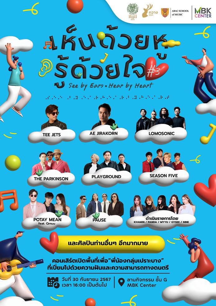 ศูนย์การค้าเอ็ม บี เค เซ็นเตอร์ ชวนมาร่วมให้กำลังใจ และสัมผัสความงดงามของดนตรีที่ เปี่ยมด้วยพลังใจไปพร้อมกันใน ฟรีคอนเสิร์ต “เห็นด้วยหู รู้ด้วยใจ ครั้งที่ 3” ในวันจันทร์ที่ 30 กันยายน 2567 ตั้งแต่เวลา 16.00 น. เป็นต้นไป บริเวณลานกิจกรรมเอ็ม บี เค อเวนิว ชั้น G โซน A เปิดพื้นที่เพื่อพี่น้องกลุ่ มเปราะบางที่เปี่ยมไปด้วยความฝั นและความสามารถทางดนตรี อาทิ ผู้พิการ ผู้สูงอายุ เด็ก และ เยาวชนในสถานพินิจให้มี โอกาสและแสดงความสามารถ เผยแพร่ผลงานเพลง และร่วมเล่นดนตรีไปกับศิลปินชั้ นนำของประเทศ นำโดย ที เจ็ตเซ็ตเตอร์ (Jetset’er) เอ๊ะ จิรากร เดอะ พาร์กินสัน (The Parkinson) โปเต้ วงมีน (MEAN) โลโมโซนิก (Lomosonic) เพลย์กราวด์ (PLAYGROUND) พอส (Pause) ซีซั่นไฟฟ์ (Season Five) คิวมู (Qmuu) และศิลปินอีกมากมายร่วมส่ งมอบความสุขด้วยเสียงเพลง