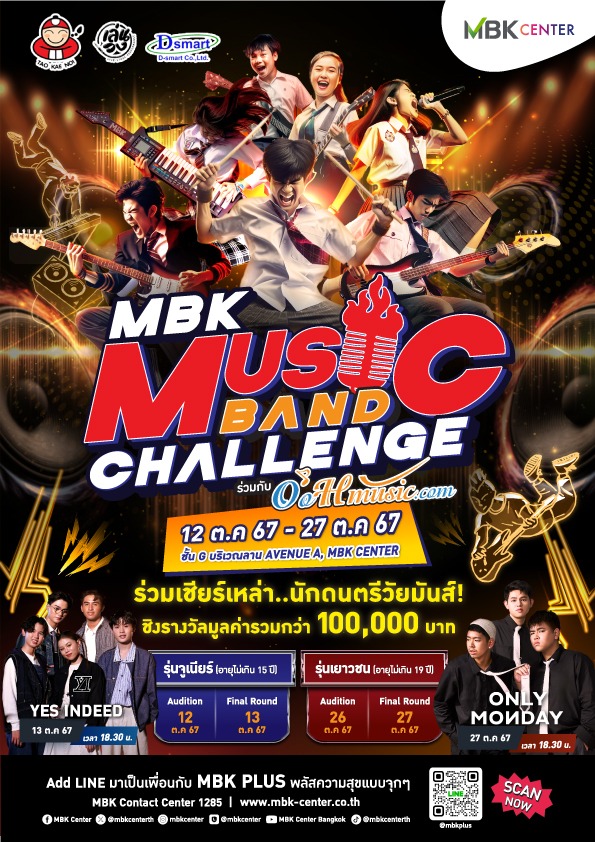 ศูนย์การค้าเอ็ม บี เค เซ็นเตอร์ สร้างปรากฏการณ์ ทางดนตรีครั้งใหม่ ร่วมกับ Oohmusic.com จัดการแข่ งขันวงดนตรีวัยมันส์ MBK MUSIC BAND CHALLENGE เปิดพื้นที่เวทีแห่ งการสร้างสรรค์ให้เหล่านักดนตรี รุ่นใหม่ที่มีดนตรีในหัวใจได้ มาโชว์ความสามารถ ชิงรางวัลมูลค่ารวมกว่า 100,000 บาท พร้อมระเบิดความมันส์ตั้งแต่วั นเสาร์ที่ 12 – วันอาทิตย์ที่ 27 ตุลาคม 2567 เวลา 11.00 น. – 21.00 น. บริเวณชั้น G ลานกิจกรรมเอ็ม บี เค อเวนิว โซน A