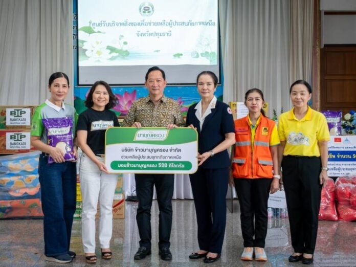 นางสาวพิมลรัตน์ จิตต์ภาวนาสกุล ผู้ช่วยกรรมการผู้จัดการใหญ่สายการตลาด บริษัท พี อาร์ จี คอร์ปอเรชั่น จำกัด (มหาชน) (ที่ 2 จากซ้าย)  ผู้บริหารกลุ่มธุรกิจในเครือข้าวมาบุญครอง  มอบข้าวสารคุณภาพกว่า 500 กิโลกรัม พร้อมน้ำดื่มคูลพลัส 1,200 ขวด ผ่านศูนย์ช่วยเหลือผู้ประสบอุทกภัยภาคเหนือของจังหวัดปทุมธานี โดยมีนายภาสกร บุญญลักษม์ ผู้ว่าราชการจังหวัดปทุมธานี (ที่ 3 จากซ้าย)   พร้อมด้วย นางบุษบา บุญญลักษม์ นายกเหล่ากาชาดจังหวัดปทุมธานี (ที่ 4 จากซ้าย)  เป็นผู้แทนในการรับมอบ เพื่อส่งมอบความช่วยเหลือไปยังพี่น้องภาคเหนือ ที่เผชิญปัญหาอุทกภัยอย่างต่อเนื่อง ภายในงานเปิดศูนย์ช่วยเหลือผู้ประสบอุทกภัยภาคเหนือของจังหวัดปทุมธานี อาคารศาลารักษ์ ศาลากลางจังหวัดปทุมธานี