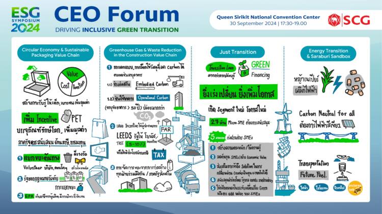 47 องค์กรเอกชนจากธุรกิจค้าปลีก ธุรกิจค้าส่ง ธุรกิจอสังหาฯ ธุรกิจบรรจุภัณฑ์ ธุรกิจน้ำตาล ผู้ผลิตปูนซีเมนต์ ผู้ผลิตวัสดุก่อสร้าง นิคมอุตสาหกรรม และประธานสมาพันธ์เอสเอ็มอีไทย ผนึกพลังในงาน CEO Forum : SCG ESG Symposium 2024 ร่วมระดมสมองเฟ้น 6 แนวทาง ได้แก่ 1. การส่งเสริมการใช้บรรจุภัณฑ์ยั่งยืน 2. มุ่งขับเคลื่อนจัดการเศษวัสดุเหลือใช้ 3. การออกแบบอาคารที่คำนึงถึงการลดก๊าซเรือนกระจก 4. การลดก๊าซเรือนกระจกในห่วงโซ่คุณค่าของอุตสาหกรรมก่อสร้าง 5. การส่งเสริมผู้ประกอบการ SMEs ปรับตัวให้ทันต่อการเปลี่ยนแปลงของโลก และ 6. การเปลี่ยนผ่านสู่พลังงานสะอาด และการใช้ ‘สระบุรีแซนด์บ็อกซ์’ เป็นพื้นที่ทดลอง เพื่อเสนอรัฐบาลผลักดันประเทศไทยเดินหน้าสู่สังคมคาร์บอนต่ำ และเพิ่มความสามารถการแข่งขันให้กับประเทศ