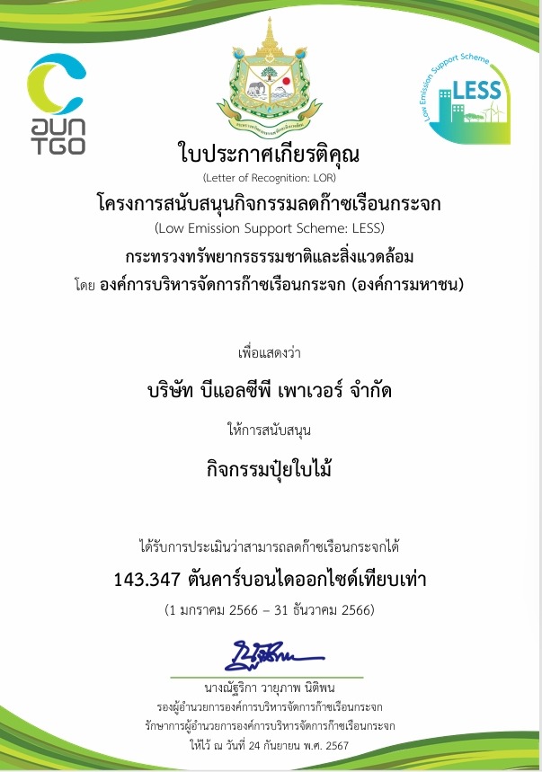 โรงไฟฟ้าบีแอลซีพี ได้รับใบประกาศเกียรติคุณจากองค์การบริหารจัดการก๊าซเรือนกระจก (องค์การมหาชน) กระทรวงทรัพยากรธรรมชาติและสิ่งแวดล้อม ในโครงการสนับสนุนกิจกรรมลดก๊าซเรือนกระจก (LESS) จากโครงการ “ปุ๋ยใบไม้” ที่ช่วยลดก๊าซเรือนกระจกได้ถึง 143.347 ตันคาร์บอนไดออกไซด์เทียบเท่า และโครงการ สะท้อนความมุ่งมั่นในการดำเนินธุรกิจตามแนวทาง ESG และสนับสนุนเป้าหมายการพัฒนาที่ยั่งยืน (SDGs)