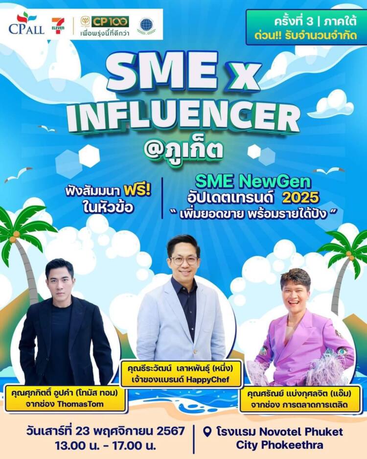 งานฟรีกลับมาอีกครั้งกับ “SME x Influencer” ออนทัวร์ครั้งที่ 3 ที่จังหวัดภูเก็ต เป็นครั้งสุดท้ายของปี กับหัวข้อ “SME NewGen อัปเดตเทรนด์ 2025 เพิ่มยอดขาย พร้อมรายได้ปัง” ที่จะพาทุกคนมาทำความรู้จักเทรนด์ใหม่ ๆ เพื่อเตรียมพร้อมสู่ยอดขายที่พุ่งกระฉูดในปี 2025 ไม่ว่าจะเป็นเทรนด์การทำคอนเทนต์ การขายสินค้า หรือการสร้าง แบรนด์และตัวตนแบบมืออาชีพ สอดคล้องกับนโยบายของซีพี ออลล์ในการส่งเสริมเพื่อสร้างอาชีพให้แก่ SME ใครที่อยู่ภูเก็ตและพื้นที่ใกล้เคียงไม่ควรพลาด!